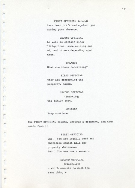 Description Page 121 of revised draft script for Orlando. Black printed text on A4 paper bound with a plastic comb spine