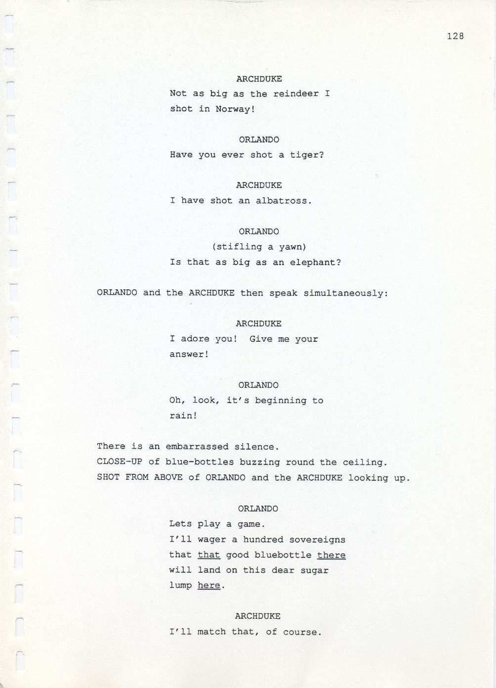 Description Page 128 of revised draft script for Orlando. Black printed text on A4 paper bound with a plastic comb spine