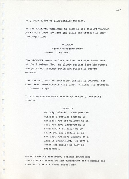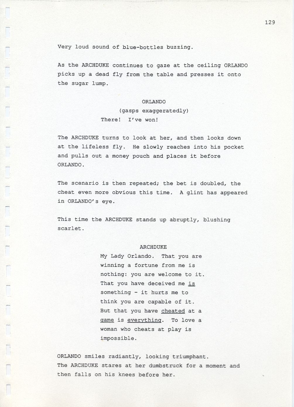 Description Page 129 of revised draft script for Orlando. Black printed text on A4 paper bound with a plastic comb spine