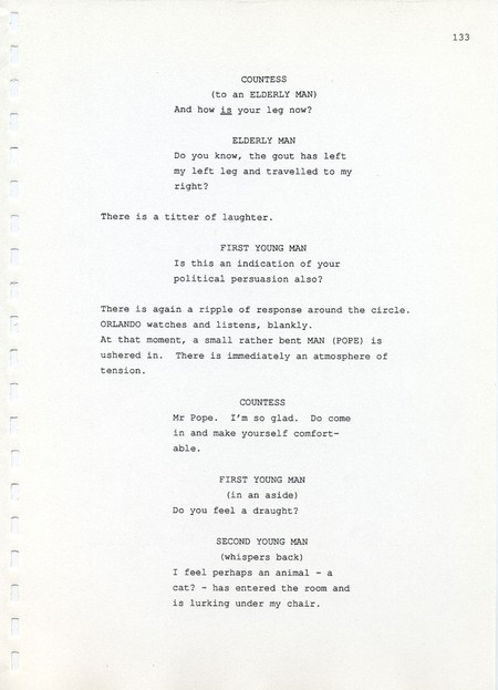 Description Page 133 of revised draft script for Orlando. Black printed text on A4 paper bound with a plastic comb spine
