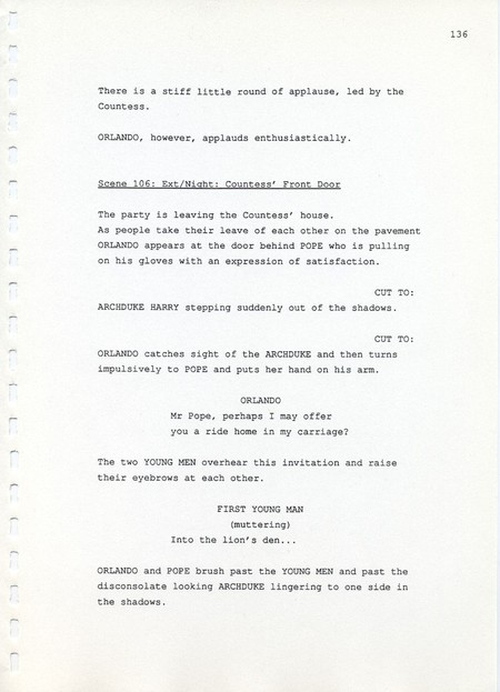 Description Page 136 of revised draft script for Orlando. Black printed text on A4 paper bound with a plastic comb spine