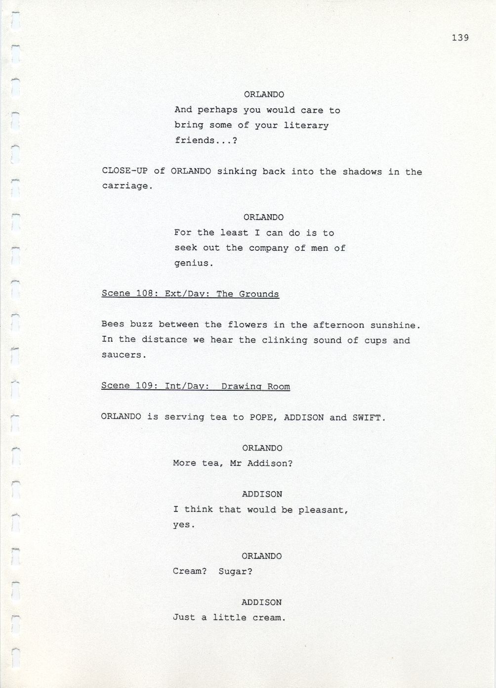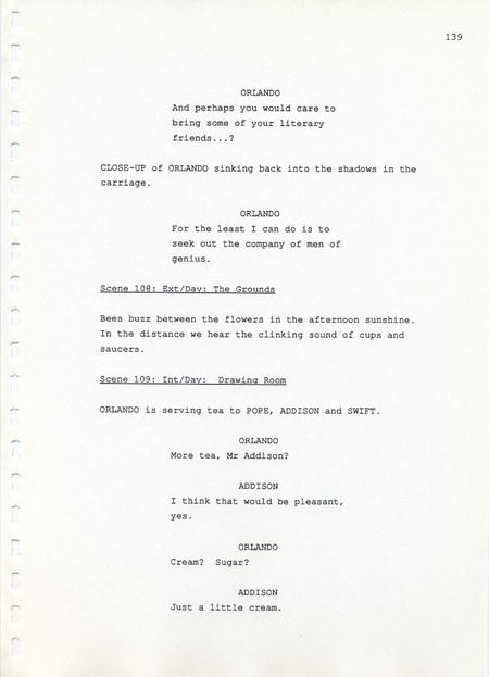 Description Page 139 of revised draft script for Orlando. Black printed text on A4 paper bound with a plastic comb spine