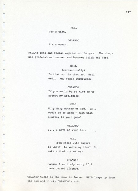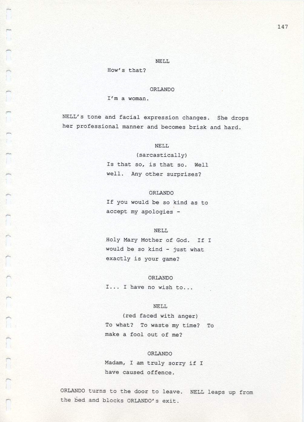 Description Page 147 of revised draft script for Orlando. Black printed text on A4 paper bound with a plastic comb spine