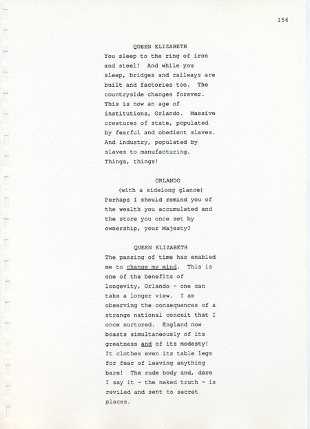 Description Page 156 of revised draft script for Orlando. Black printed text on A4 paper bound with a plastic comb spine