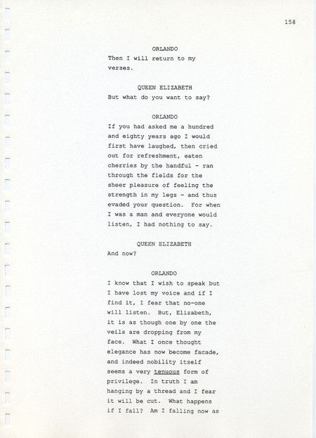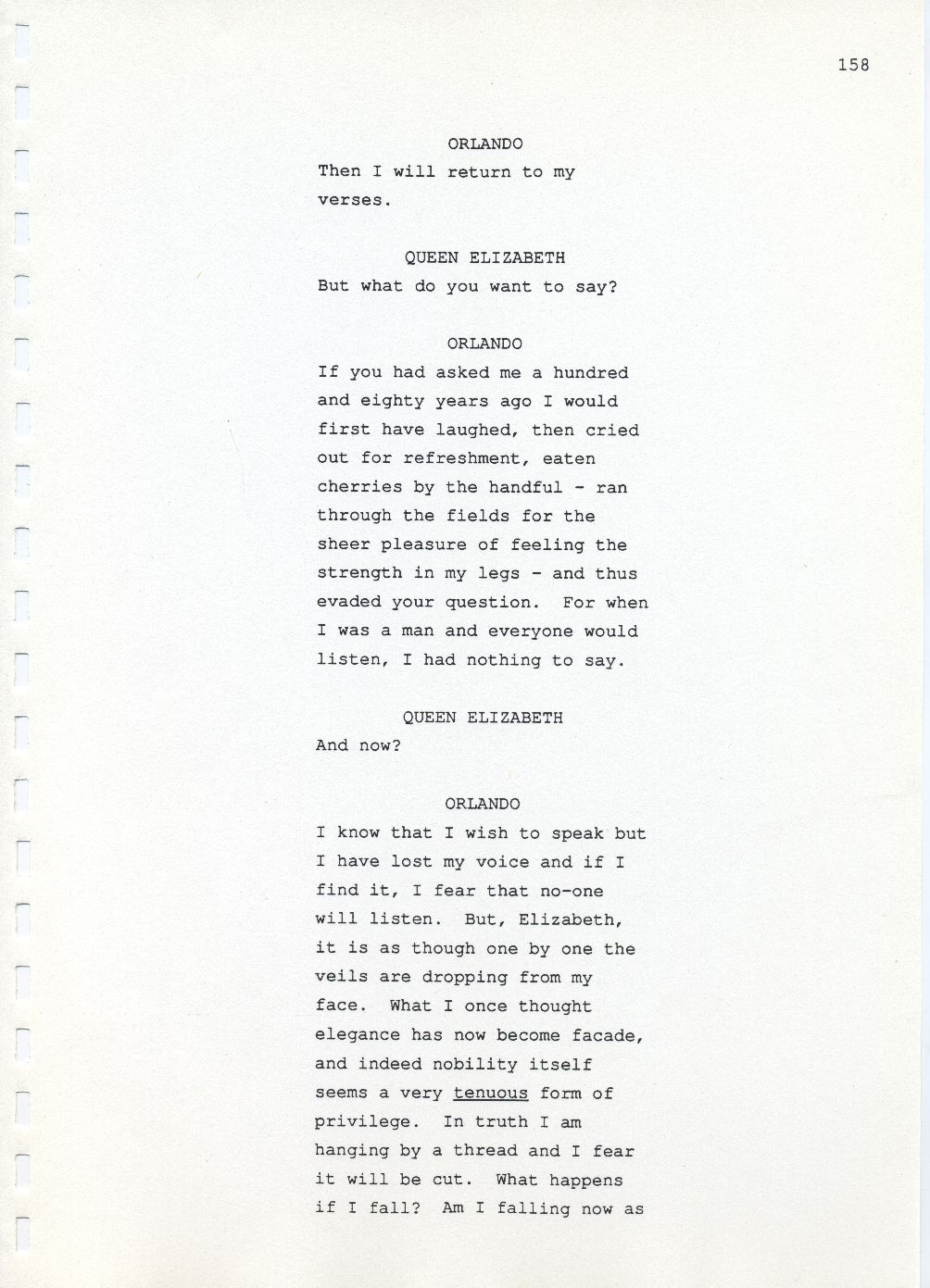 Description Page 158 of revised draft script for Orlando. Black printed text on A4 paper bound with a plastic comb spine