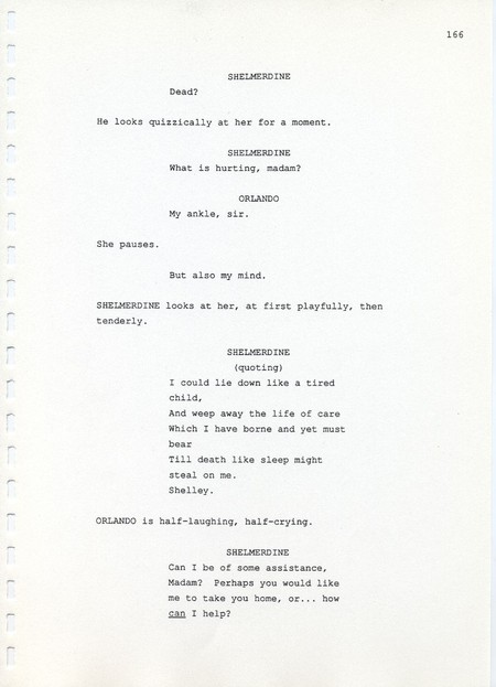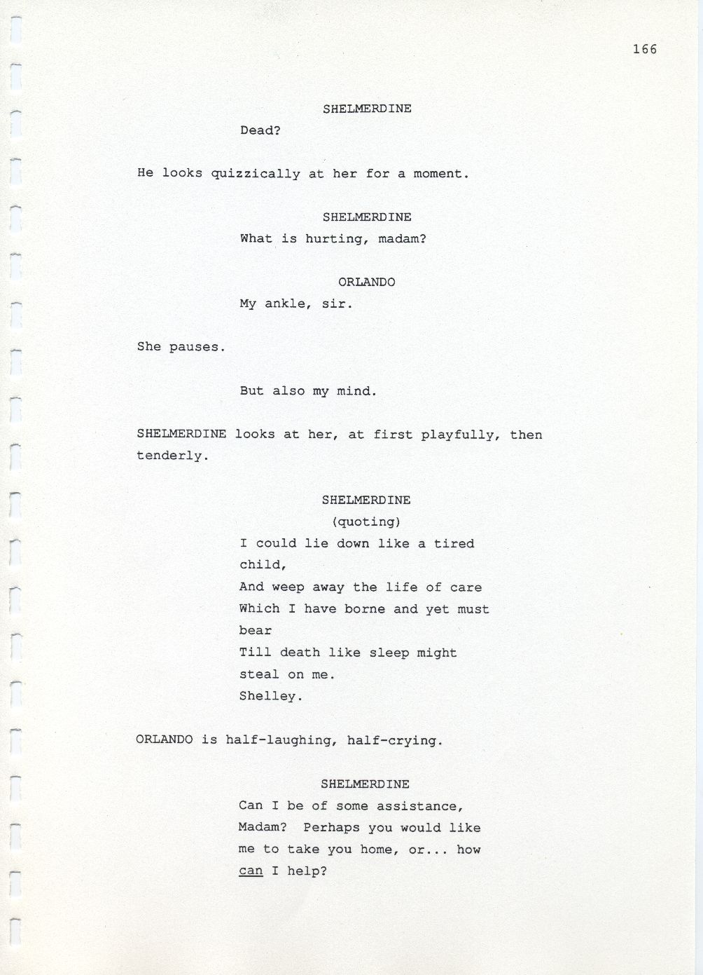Description Page 166 of revised draft script for Orlando. Black printed text on A4 paper bound with a plastic comb spine