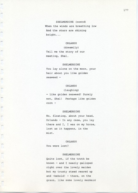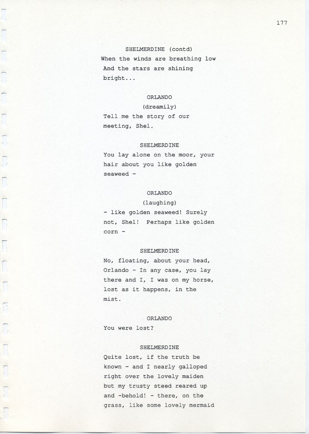 Description Page 177 of revised draft script for Orlando. Black printed text on A4 paper bound with a plastic comb spine