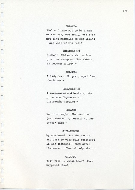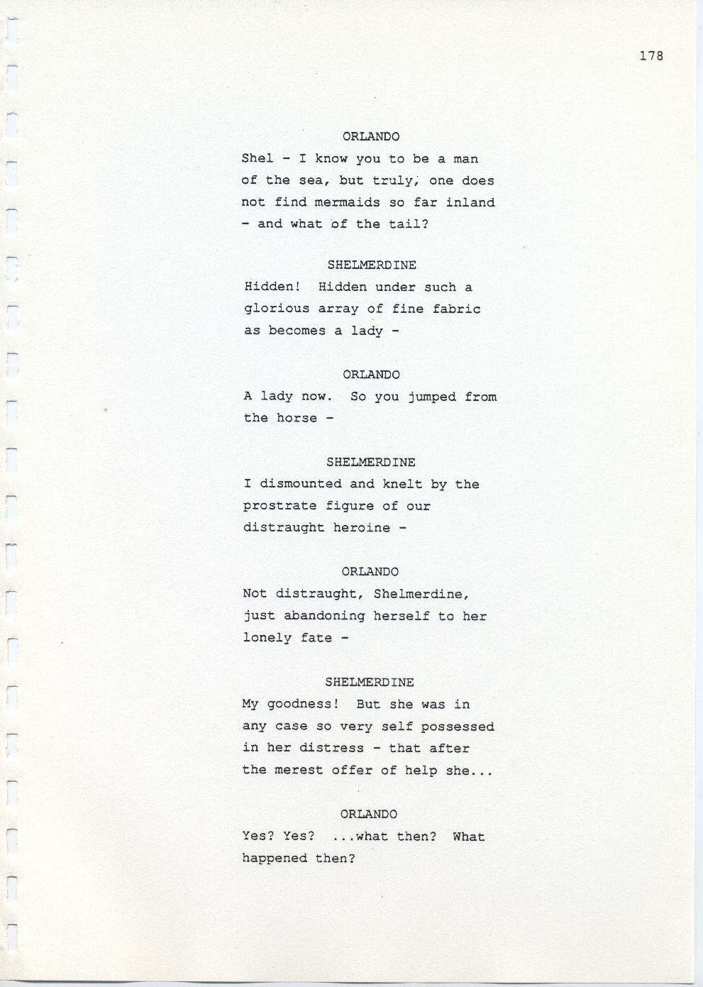 Description Page 178 of revised draft script for Orlando. Black printed text on A4 paper bound with a plastic comb spine