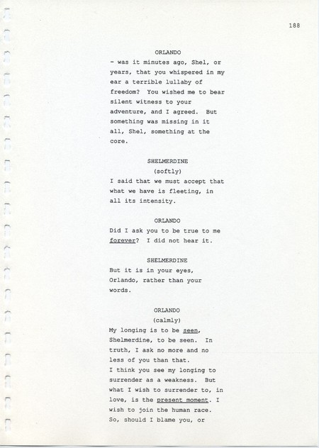 Description Page 188 of revised draft script for Orlando. Black printed text on A4 paper bound with a plastic comb spine