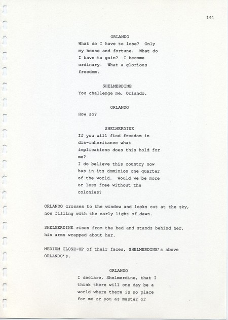 Description Page 191 of revised draft script for Orlando. Black printed text on A4 paper bound with a plastic comb spine