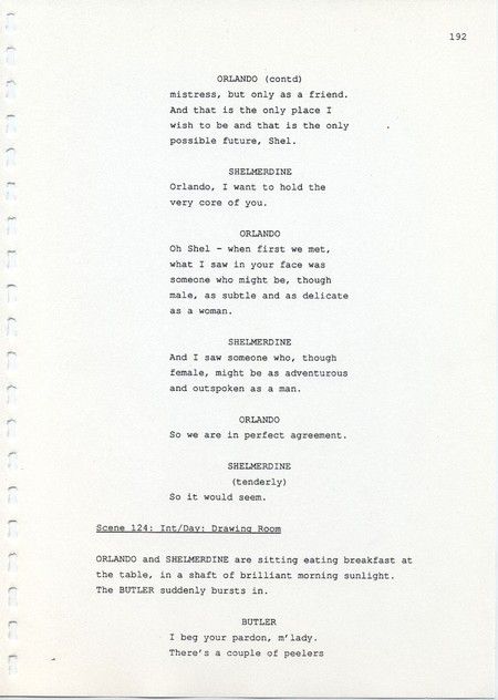 Description Page 192 of revised draft script for Orlando. Black printed text on A4 paper bound with a plastic comb spine