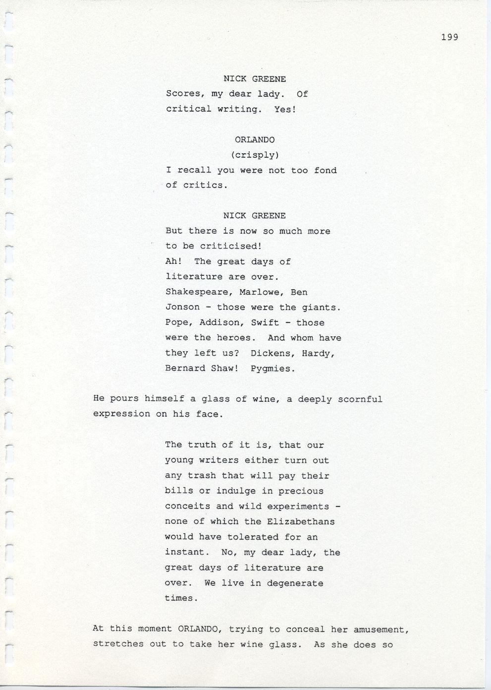 Description Page 199 of revised draft script for Orlando. Black printed text on A4 paper bound with a plastic comb spine