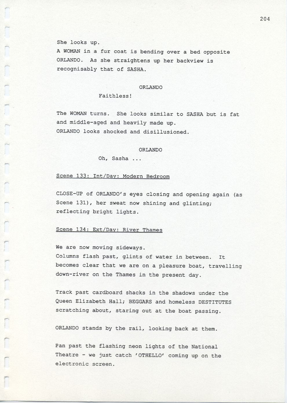 Description Page 204 of revised draft script for Orlando. Black printed text on A4 paper bound with a plastic comb spine
