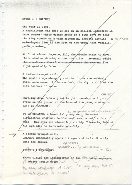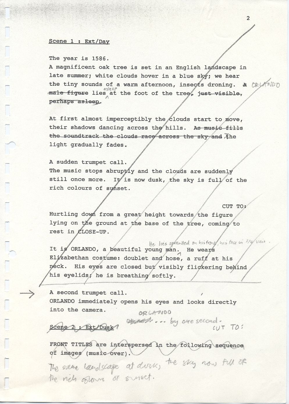 Description Page 2 of second draft script for Orlando. Black printed text with pencil annotations on A4 paper, bound with a plastic comb spine and with previous two pages attached with a paperclip