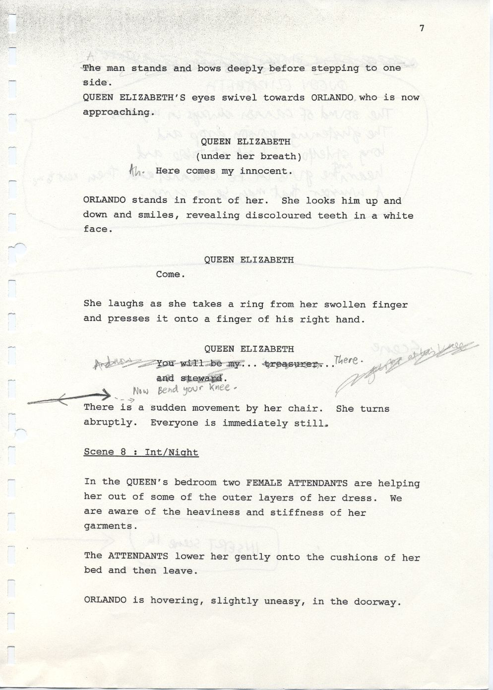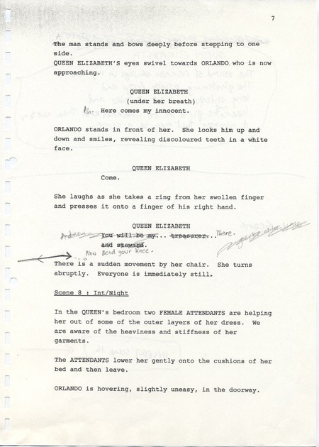 Description Page 7 of second draft script for Orlando. Black printed text with pencil annotations on A4 paper bound with a plastic comb spine