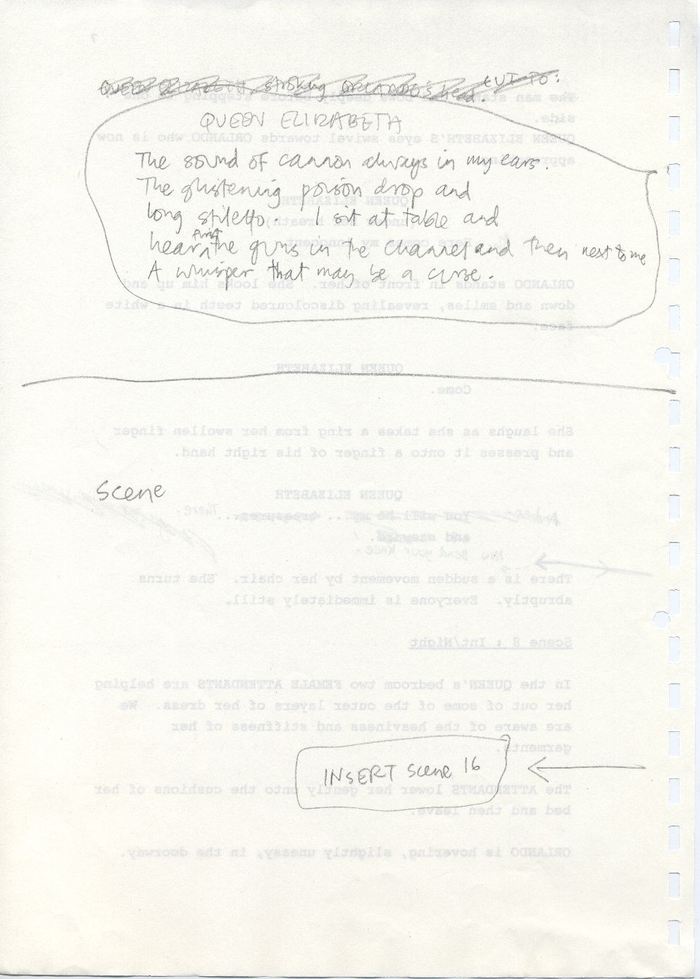 Description Reverse of page 7 of second draft script for Orlando. Handwritten scene in pencil on A4 paper bound with a plastic comb spine