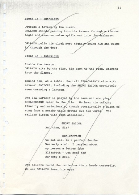 Description Page 11 of second draft script for Orlando. Black printed text with pencil annotations on A4 paper bound with a plastic comb spine