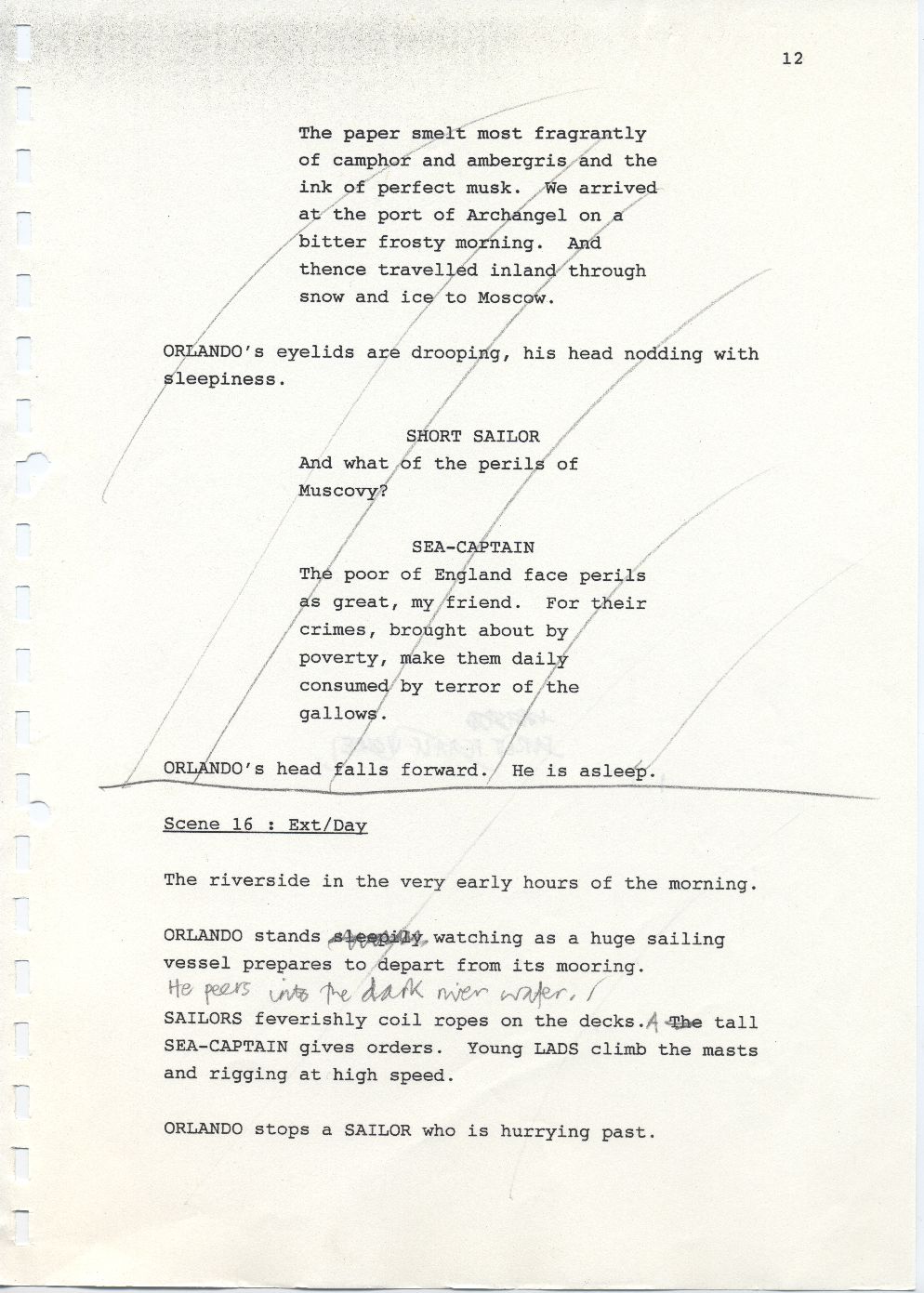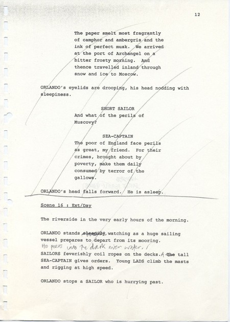 Description Page 12 of second draft script for Orlando. Black printed text with pencil annotations on A4 paper bound with a plastic comb spine