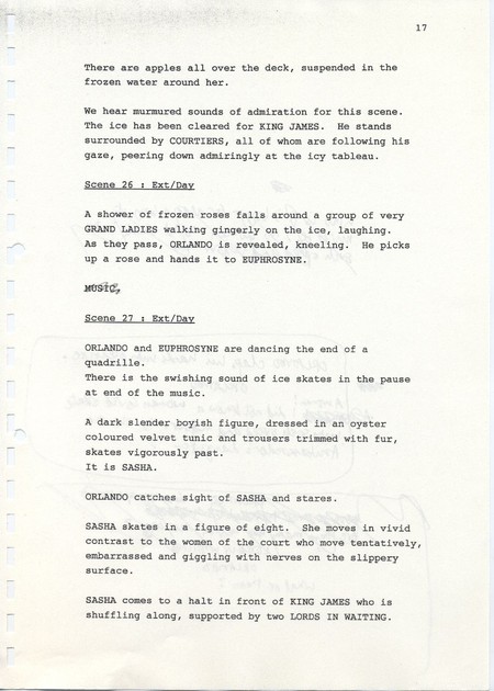 Description Page 17 of second draft script for Orlando. Black printed text with pencil annotations on A4 paper bound with a plastic comb spine