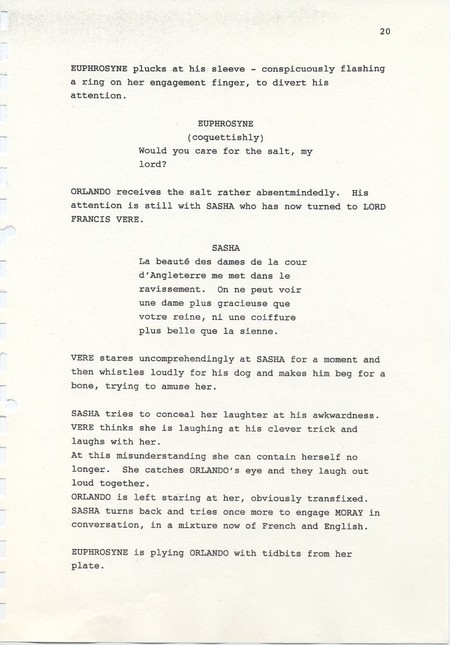 Description Page 20 of second draft script for Orlando. Black printed text on A4 paper bound with a plastic comb spine