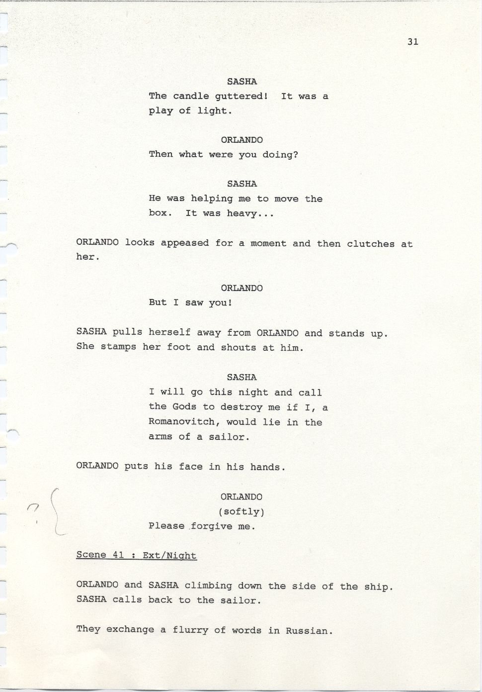 Description Page 31 of second draft script for Orlando. Black printed text with pencil annotations on A4 paper bound with a plastic comb spine