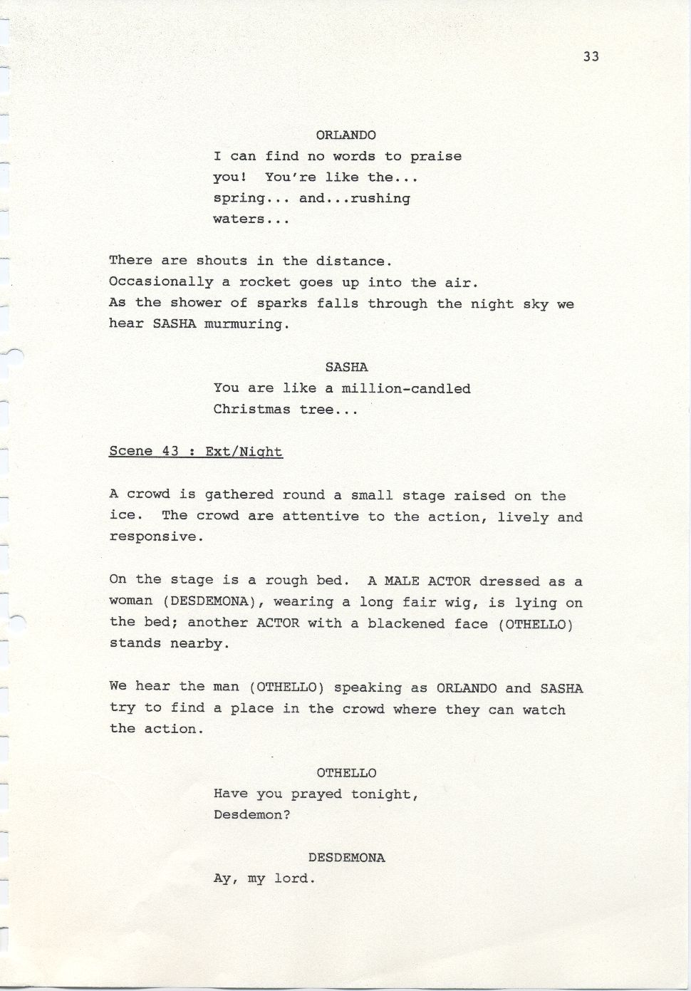 Description Page 33 of second draft script for Orlando. Black printed text on A4 paper bound with a plastic spine comb