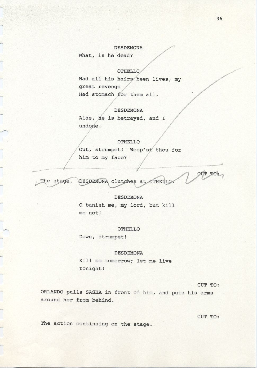 Description Page 36 of second draft script for Orlando. Black printed text with pencil annotations on A4 paper