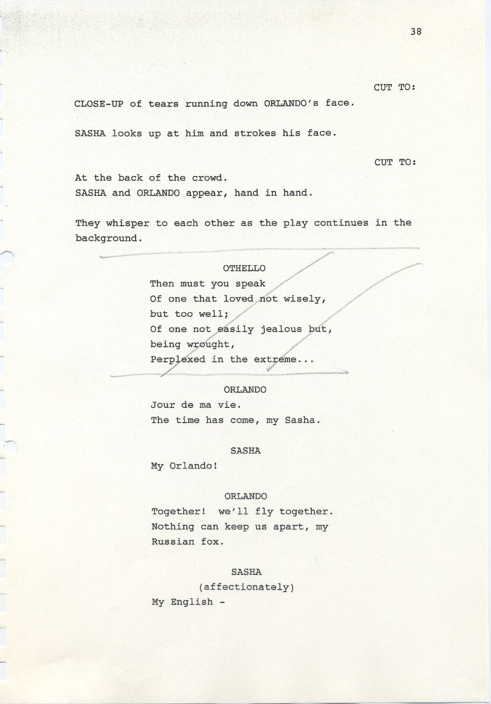Description Page 38 of second draft script for Orlando. Black printed text with pencil annotations on A4 paper bound with a plastic comb spine