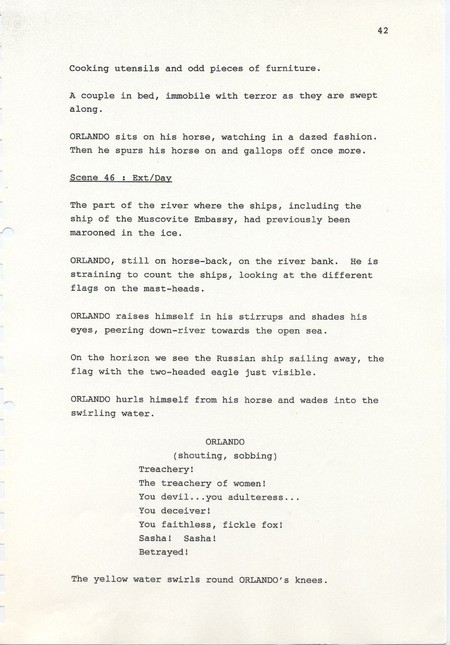 Description Page 42 of second draft script for Orlando. Black printed text on A4 paper bound with a plastic comb spine