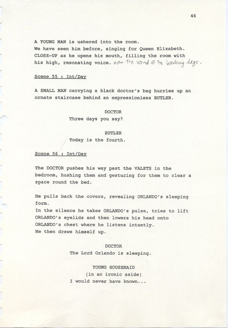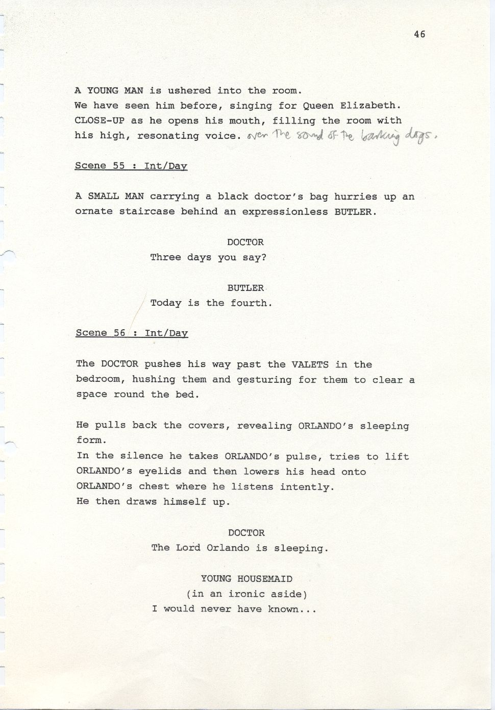 Description Page 46 of second draft script for Orlando. Black printed text with pencil annotations on A4 paper bound with a plastic comb spine