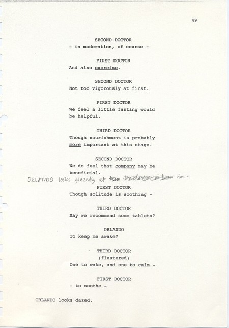 Description Page 49 of second draft script for Orlando. Black printed text with pencil annotations on A4 paper bound with a plastic comb spine