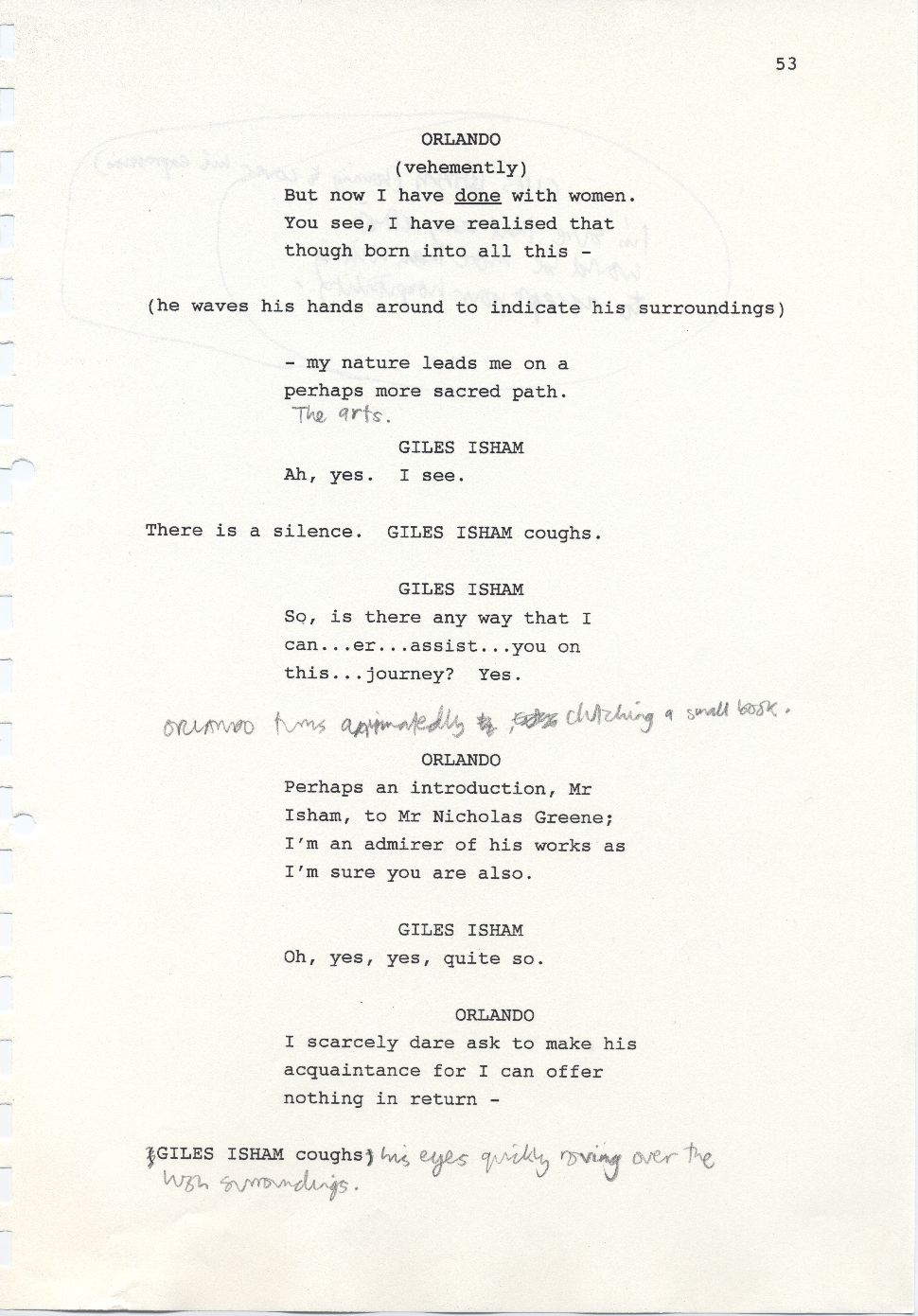 Description Page 53 of second draft script for Orlando. Black printed text with pencil annotations on A4 paper bound with a plastic comb spine