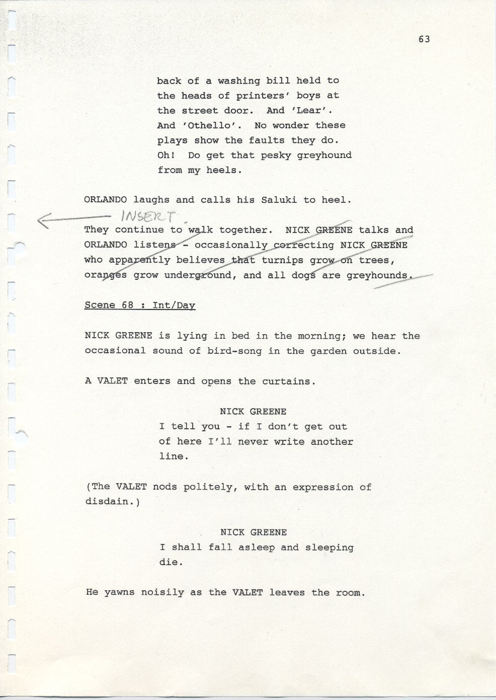 Description Page 63 of second draft script for Orlando. Black printed text with pencil annotations on A4 paper bound with a plastic comb spine