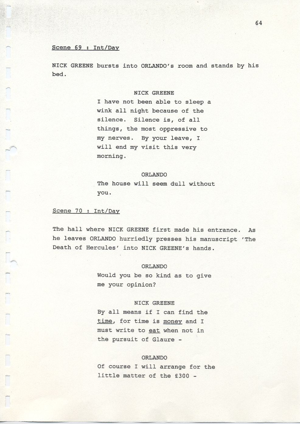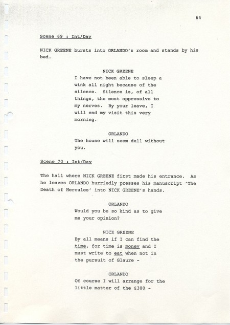 Description Page 64 of second draft script for Orlando. Black printed text on A4 paper bound with a plastic comb spine