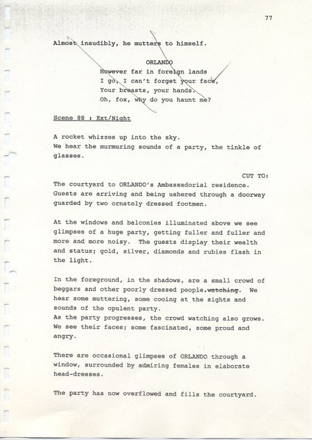 Description Page 77 of second draft script for Orlando. Black printed text with pencil annotations bound with a plastic comb spine.
