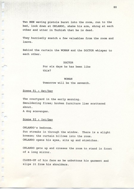 Description Page 80 of second draft script for Orlando. Black printed text on A4 paper bound with a plastic comb spine.