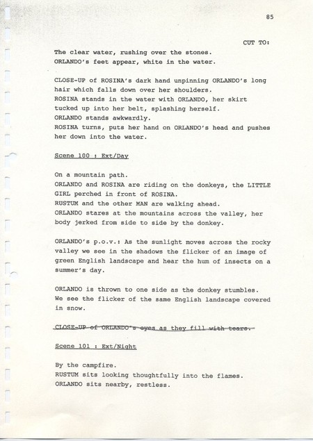 Description Page 85 of second draft script for Orlando. Black printed text on A4 paper bound with a plastic comb spine.
