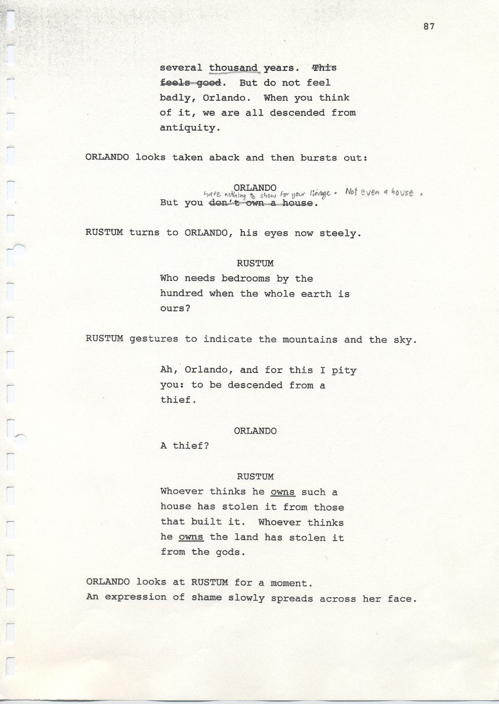 Description Page 87 of second draft script for Orlando. Black printed text with pencil annotations on A4 paper bound with a plastic comb spine.