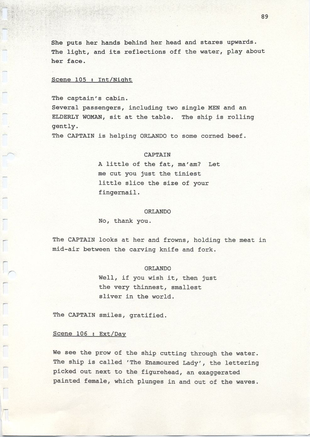 Description Page 89 of second draft script for Orlando. Black printed text on A4 paper bound with a plastic comb spine.