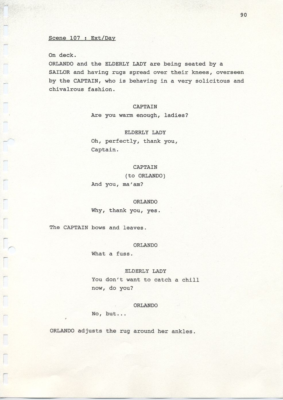 Description Page 90 of second draft script for Orlando. Black printed text on A4 paper bound with a plastic comb spine.