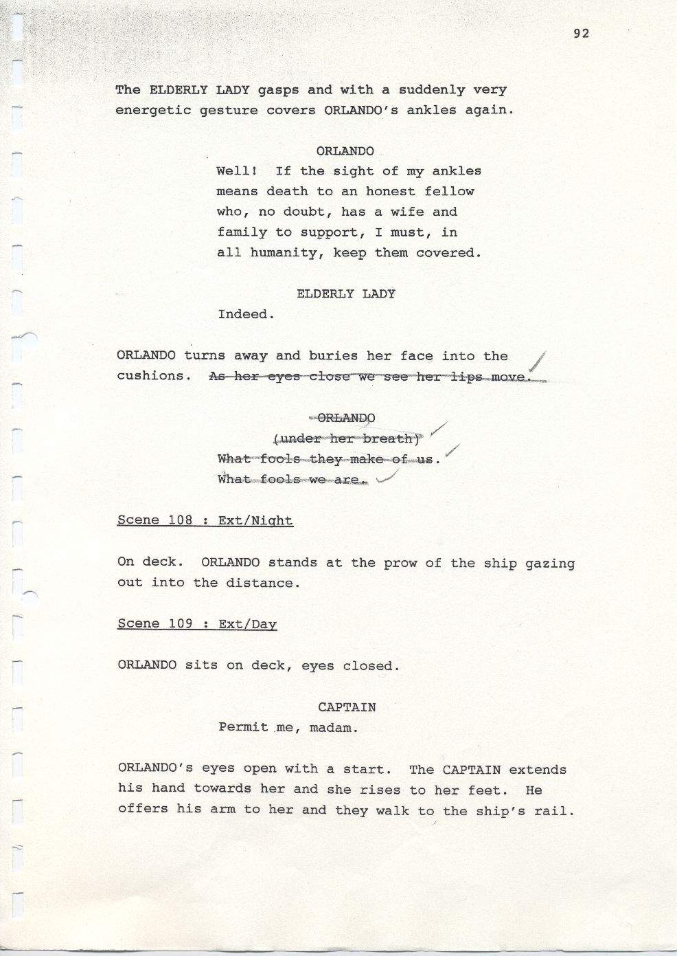 Description Page 92 of second draft script for Orlando. Black printed text with pencil annotations on A4 paper bound with a plastic comb spine. Yellow sticky note attached with handwritten note in pencil.