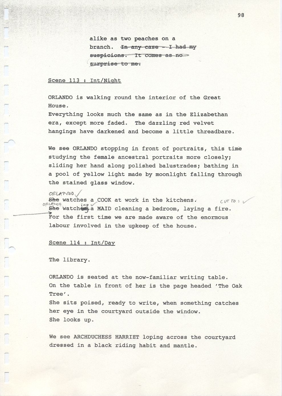 Description Page 98 of second draft script for Orlando. Black printed text with pencil annotations on A4 paper bound with a plastic comb spine.