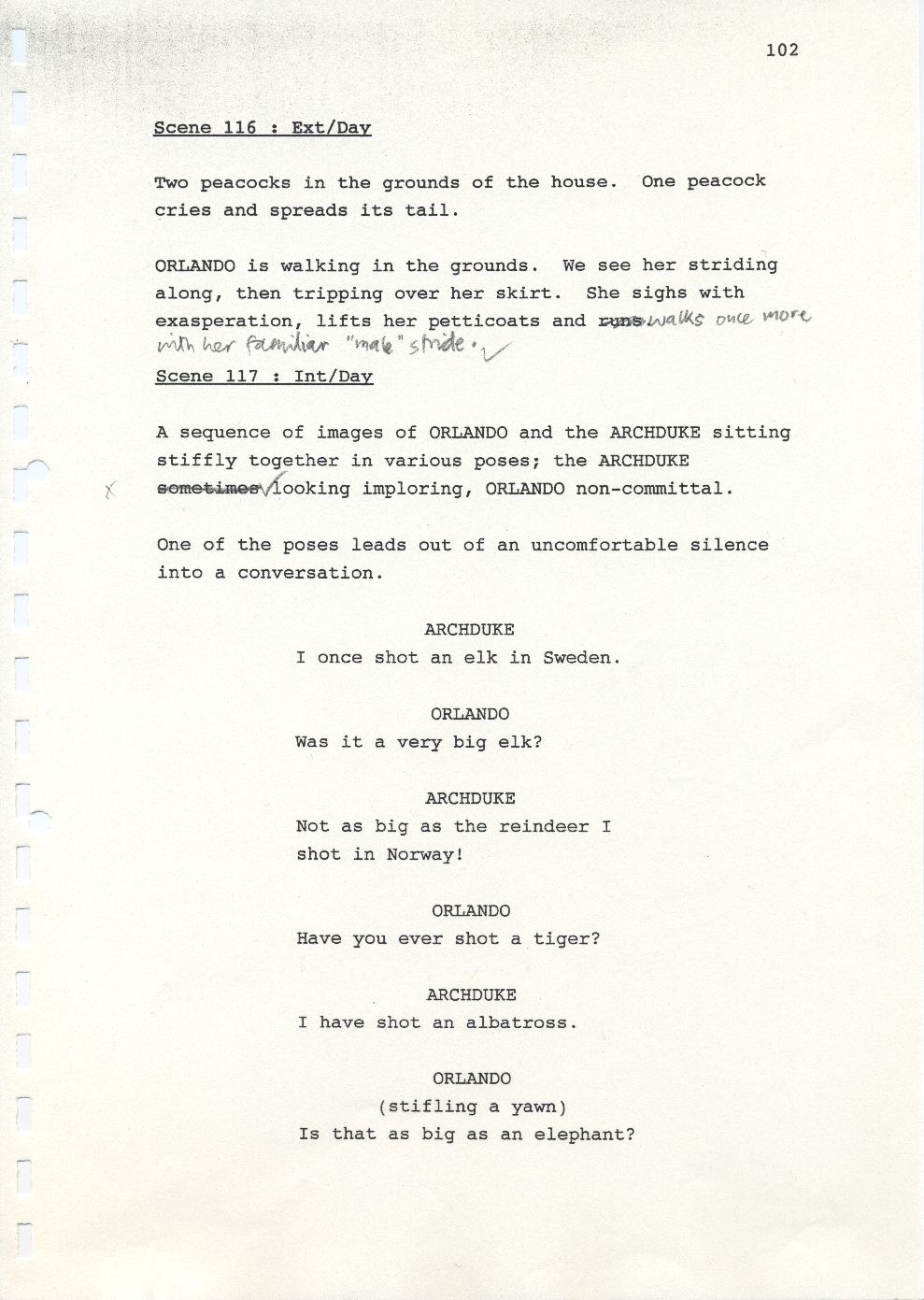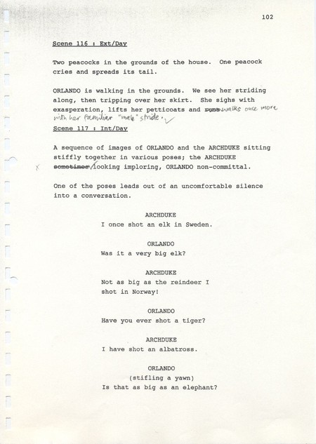 Description Page 102 of second draft script for Orlando. Black printed text with pencil annotations on A4 paper bound with a plastic comb spine.