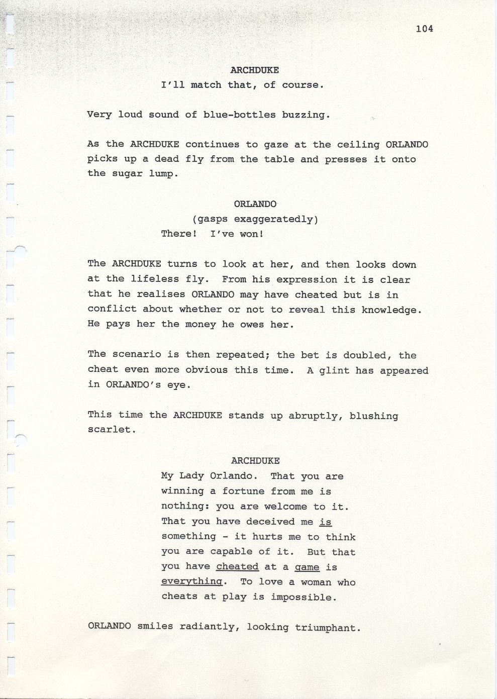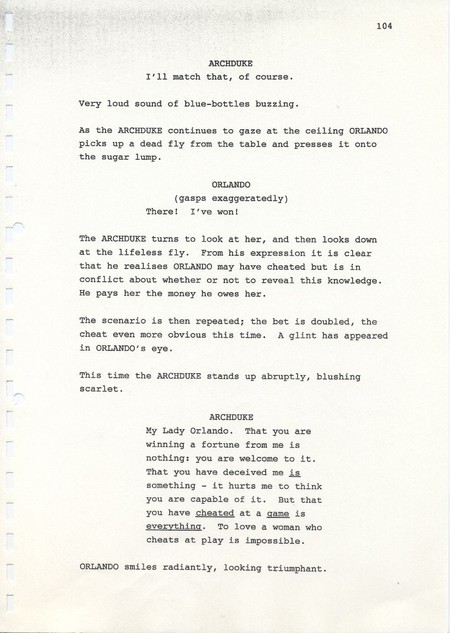 Description Page 104 of second draft script for Orlando. Black printed text on A4 paper bound with a plastic comb spine