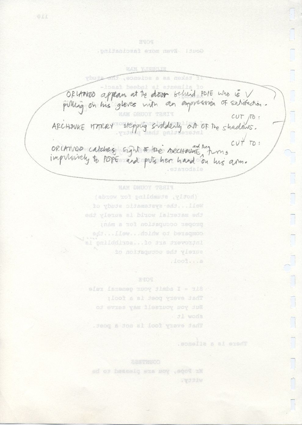 Description Reverse of page 110 of second draft script for Orlando. Handwritten script with pencil on A4 paper bound with a plastic comb spine.