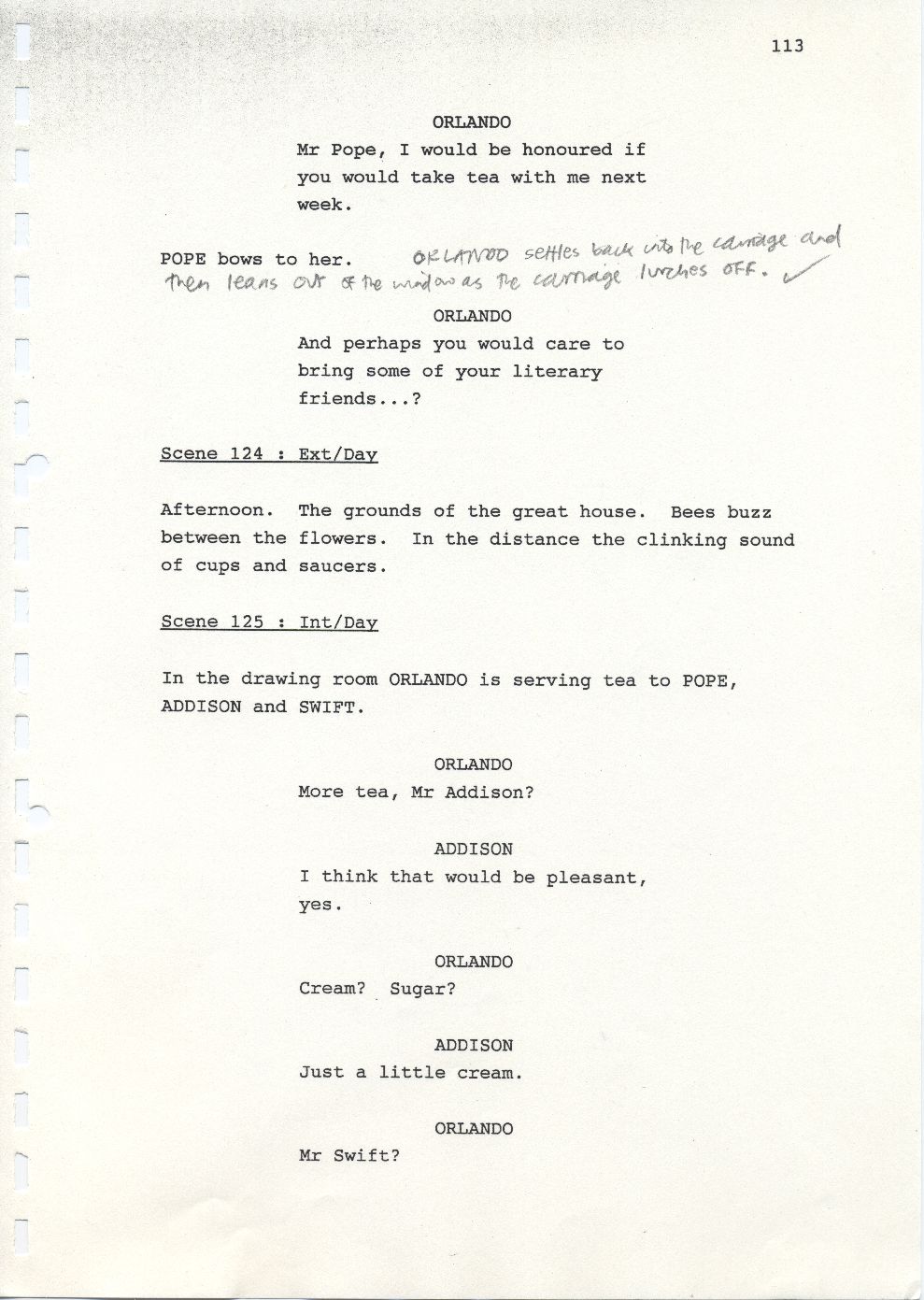 Description Page 113 of second draft script for Orlando. Black printed text with pencil annotations on A4 paper bound with a plastic comb spine.