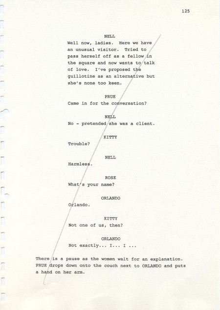 Description Page 125 of second draft script for Orlando. Black printed text with pencil annotations on A4 paper bound with a plastic comb spine.