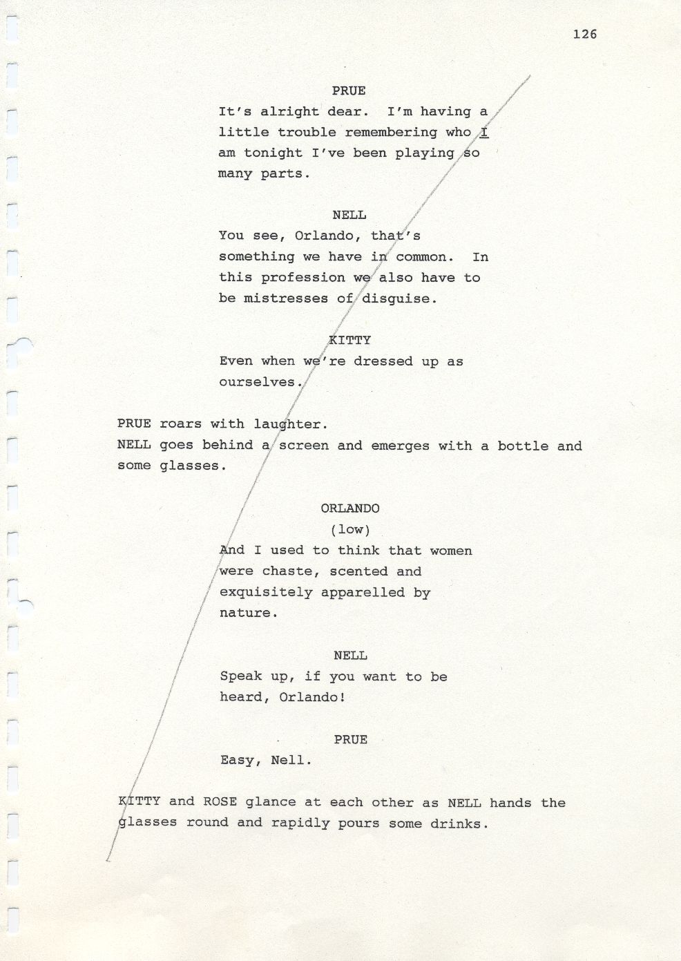 Description Page 126 of second draft script for Orlando. Black printed text with pencil annotations on A4 paper bound with a plastic comb spine.