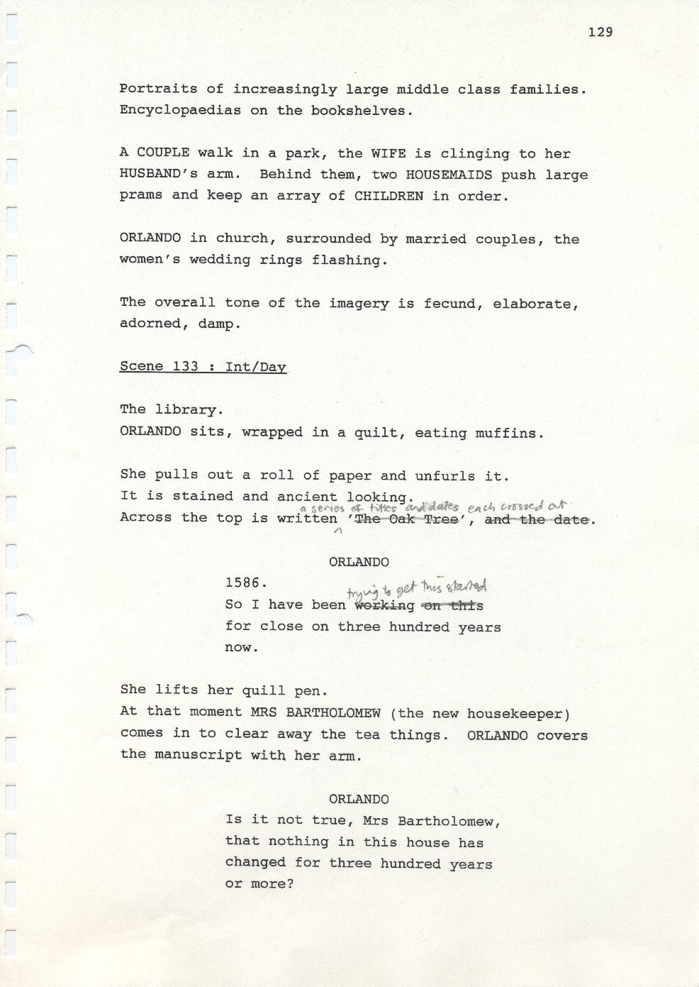 Description Page 129 of second draft script for Orlando. Black printed text with pencil annotations on A4 paper bound with a plastic comb spine.
