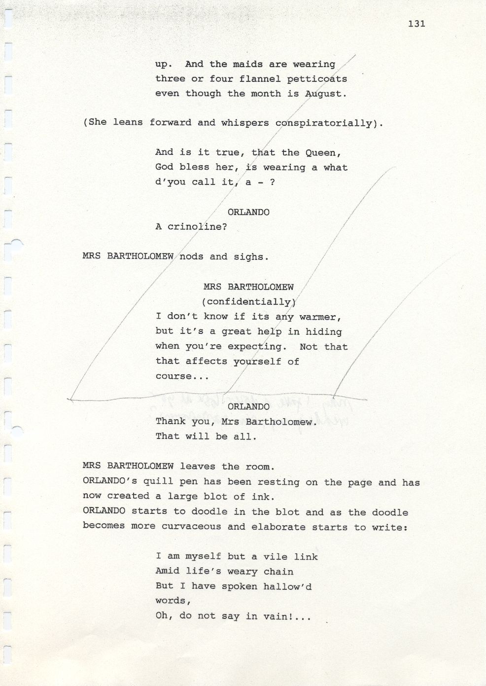 Description Page 131 of second draft script for Orlando. Black printed text with pencil annotations on A4 paper bound with a plastic comb spine.